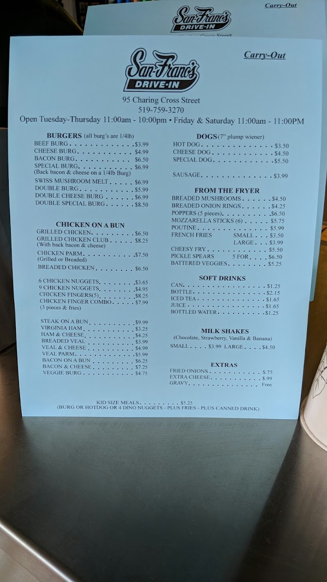 Welcome to San Franos Carry Out Ltd, a delightful culinary treasure nestled in Brantford, Ontario. Located at 95 Charing Cross St, this vibrant eatery has quickly become a local favorite, renowned for its exceptional offerings of hot dogs, burgers, and mouthwatering sides.